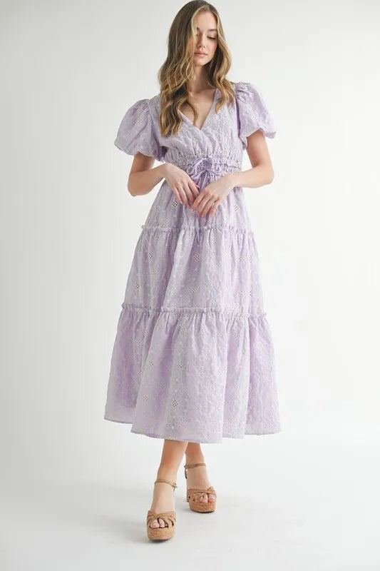 MABLE Eyelet Lace Puff Sleeve V Neck Midi Dress