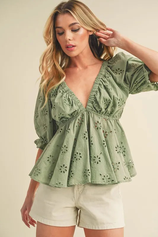 Aemi + Co Eyelet Embroidered V-Neck Half Sleeve Peplum Blouse