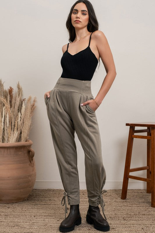 High waisted joggers. Ankle tie detail. Elastic waist on sides.