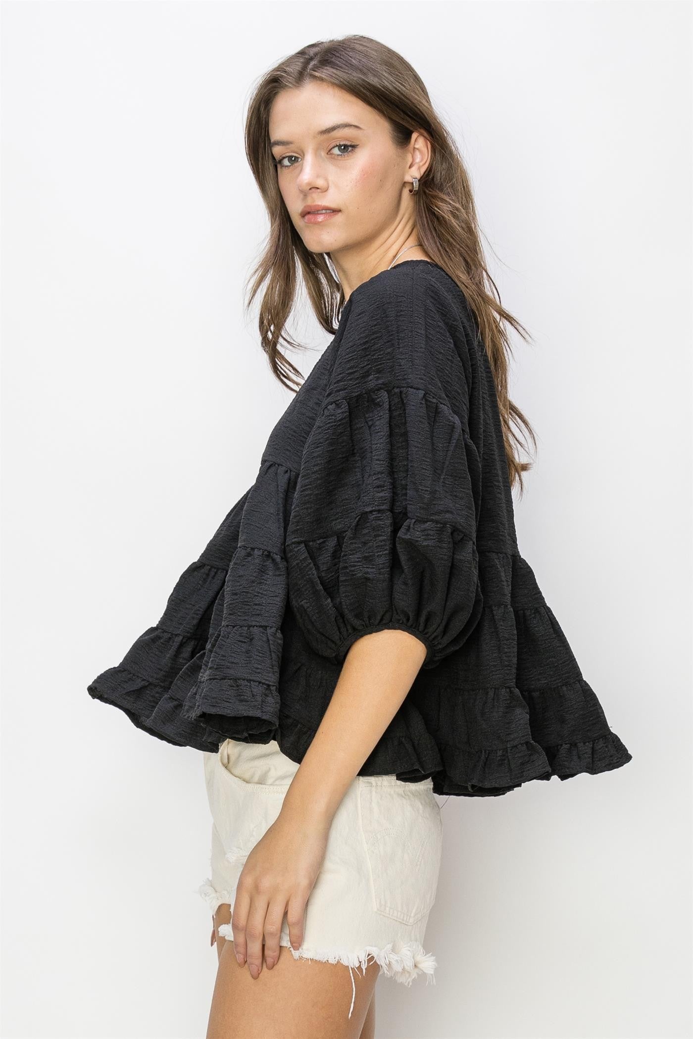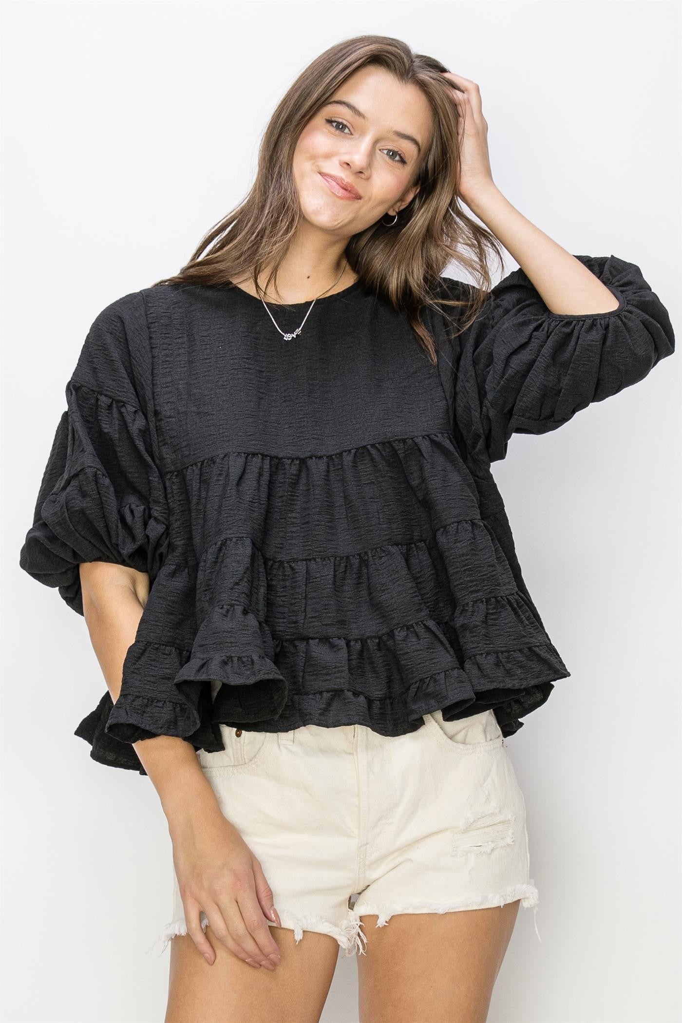 Get ready to be the sweetest one around in this Babydoll Puff Blouse! With its A-line silhouette, crew neck, and balloon sleeves, this blouse is designed to flatter. The tiers flare into a beautiful sway, adding a touch of femininity to your look. Don't miss out on this must-have piece for your wardrobe!