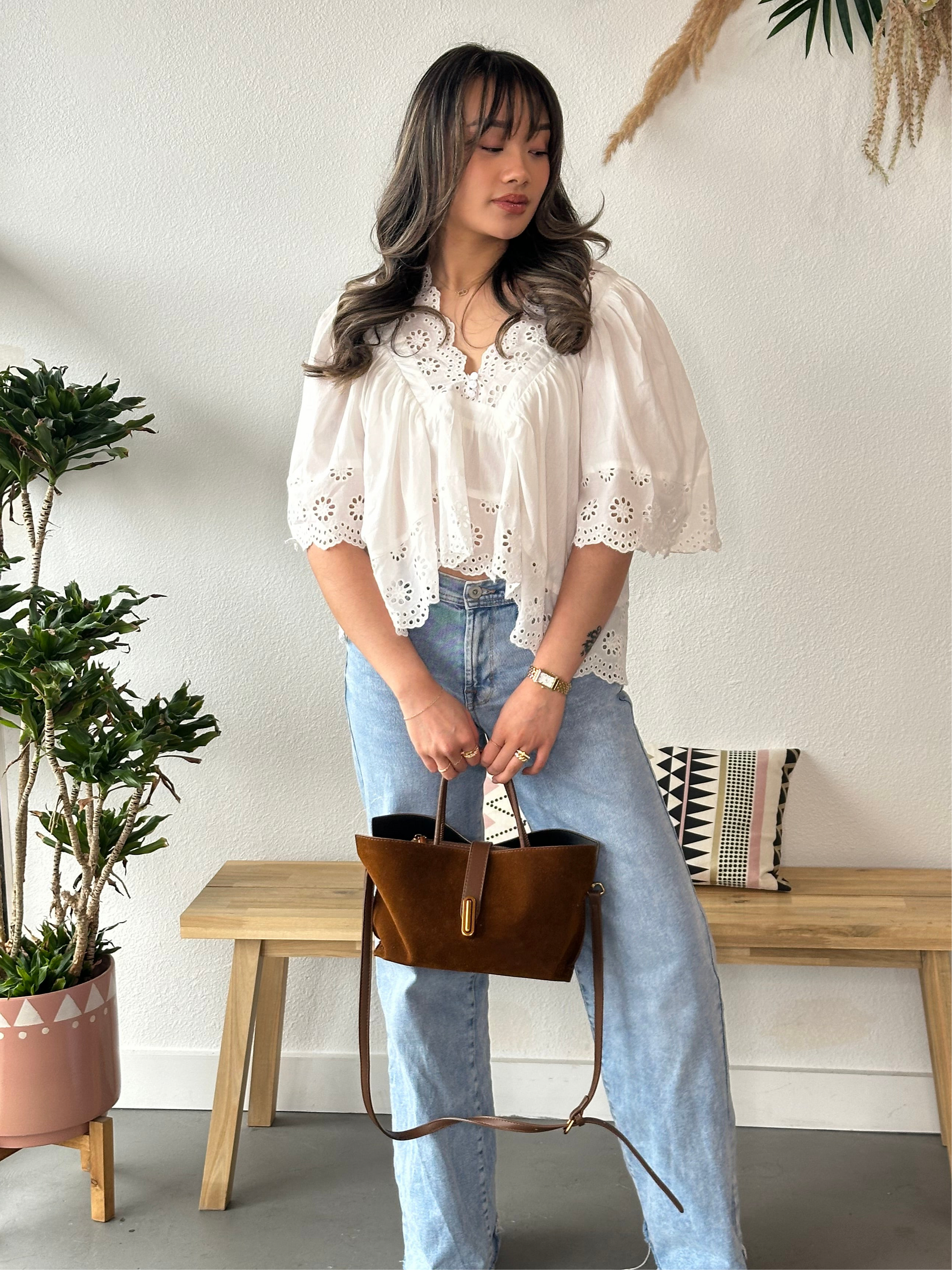 This elegant white top features intricate eyelet detailing, large flounce sleeves, and a flattering v-neckline. It is expertly crafted for a feminine and sophisticated look.