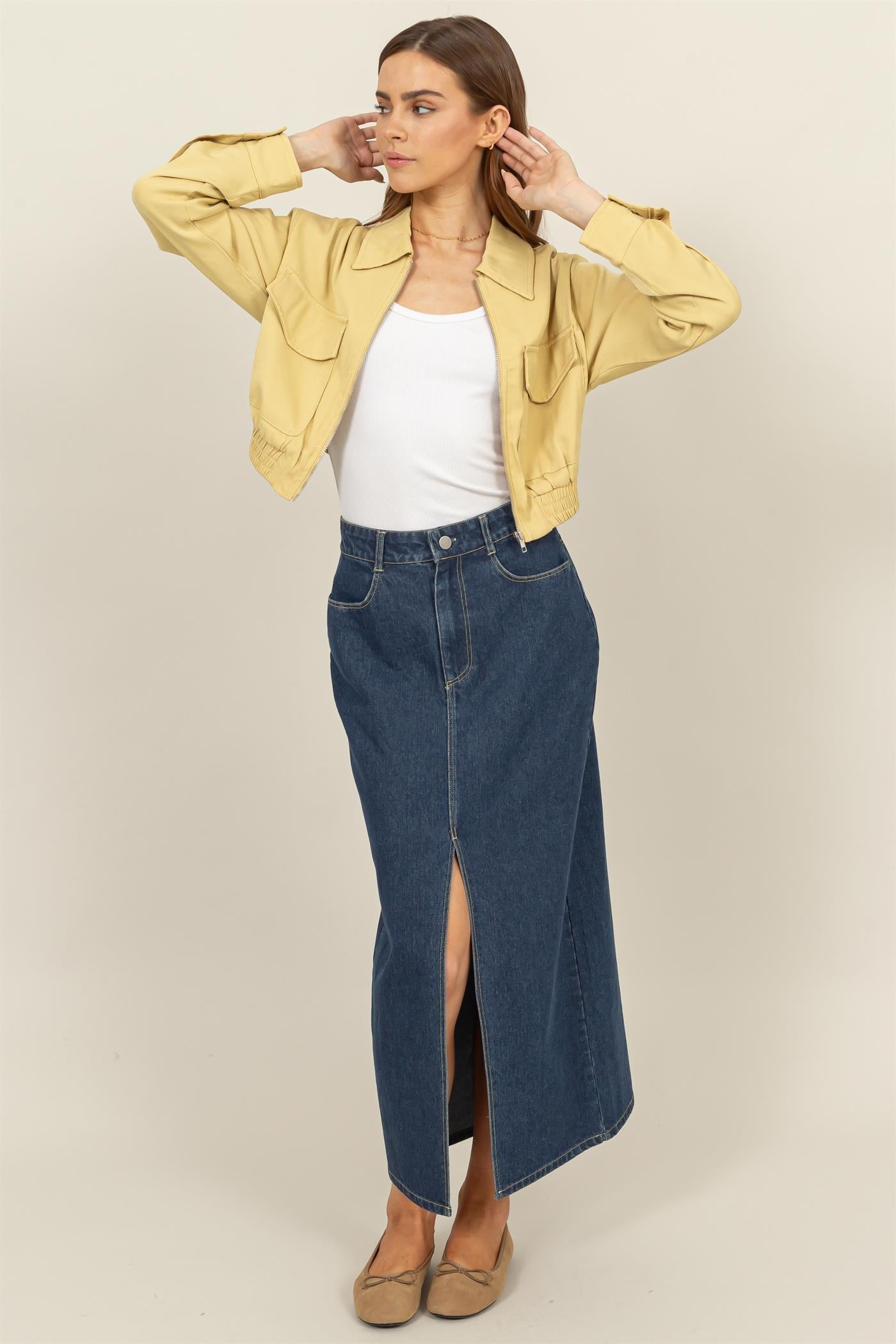 Rock your style game with our Dreamy Denim Maxi Skirt. This washed denim skirt features a trendy front slit, adding a playful touch to your outfit. Maximize your fashion potential in comfort and style. (Game changer!)