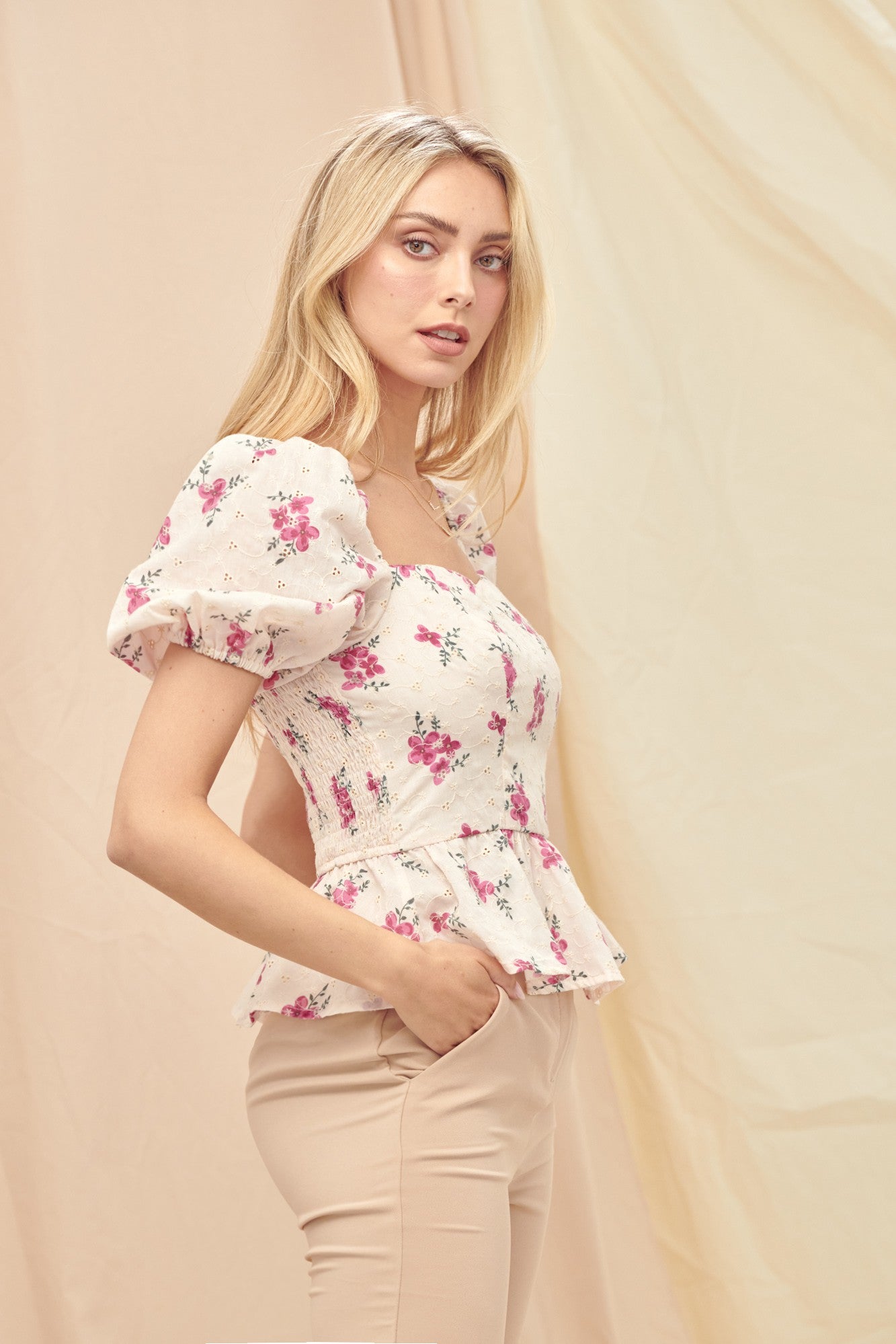 Cream eyelet peplum top with floral pattern and puff sleeve