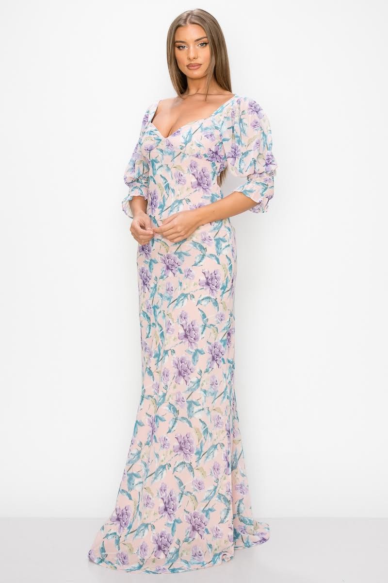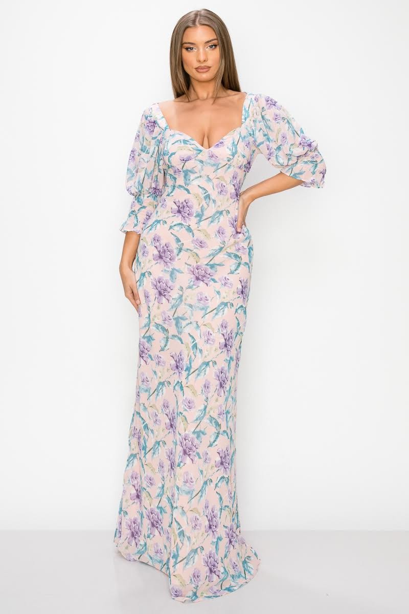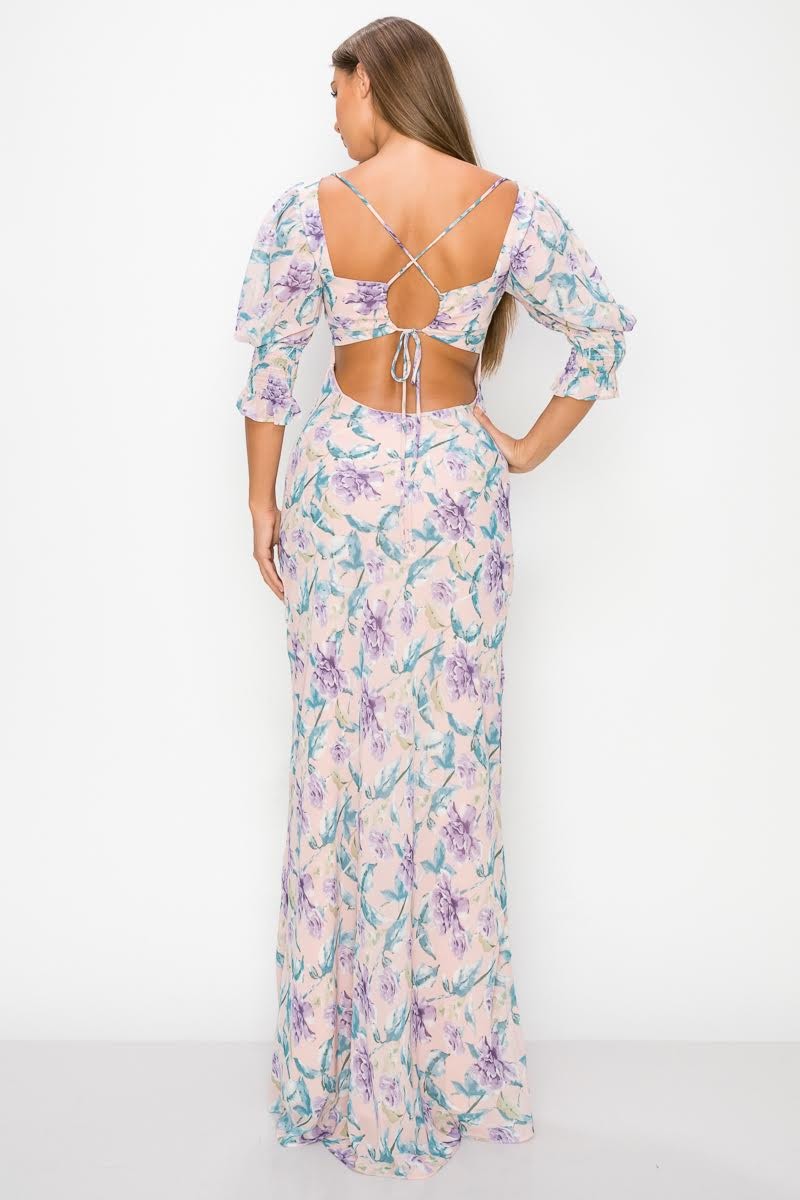 Get ready to bloom in style with our Flower Print Maxi Dress. Featuring a playful lavender and floral print, this dress is sure to turn heads. The tie back detail and elastic sleeve add the perfect touch of comfort and versatility to this must-have piece. Perfect for any occasion, this dress is a must-have for your wardrobe!