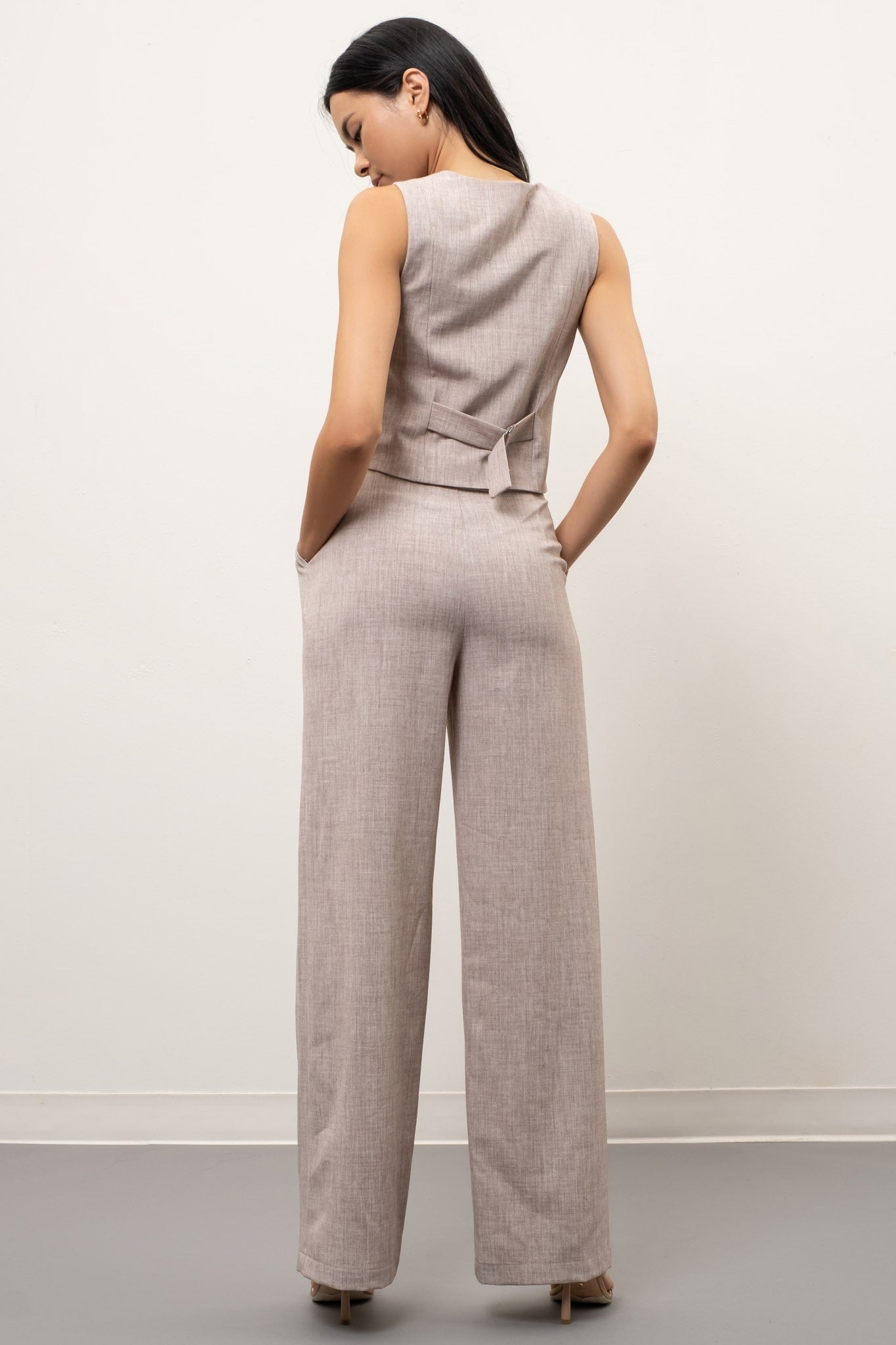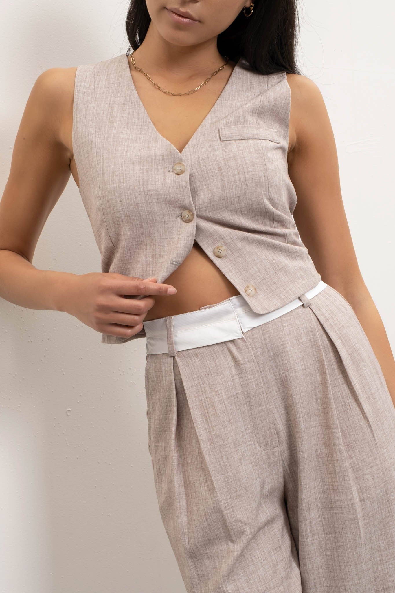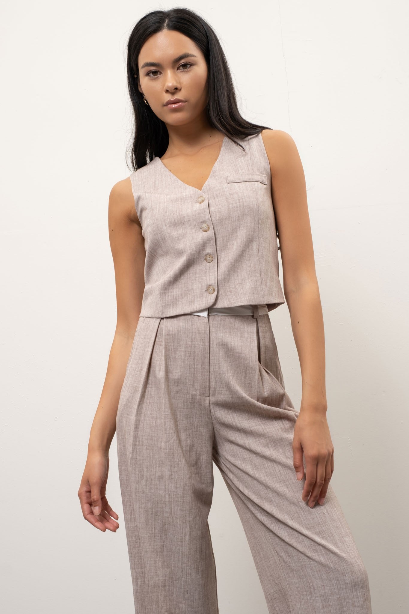 Button up your style game with our Button Down Vest! This quirky and playful vest features a cinched detail in the back for a flattering and unique touch. So go ahead, make a statement with this fun and stylish addition to your wardrobe. Matching pants sold seperately.