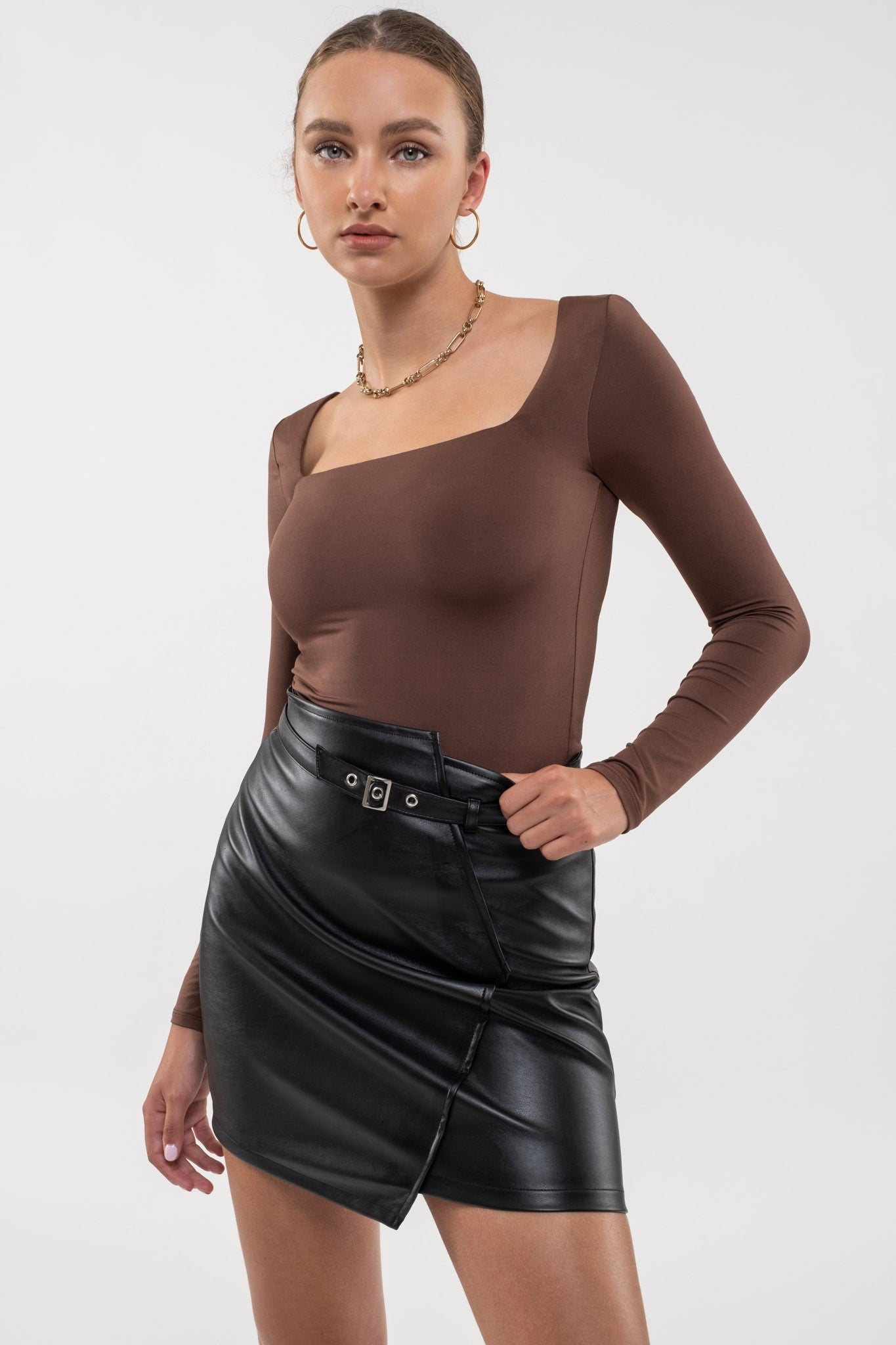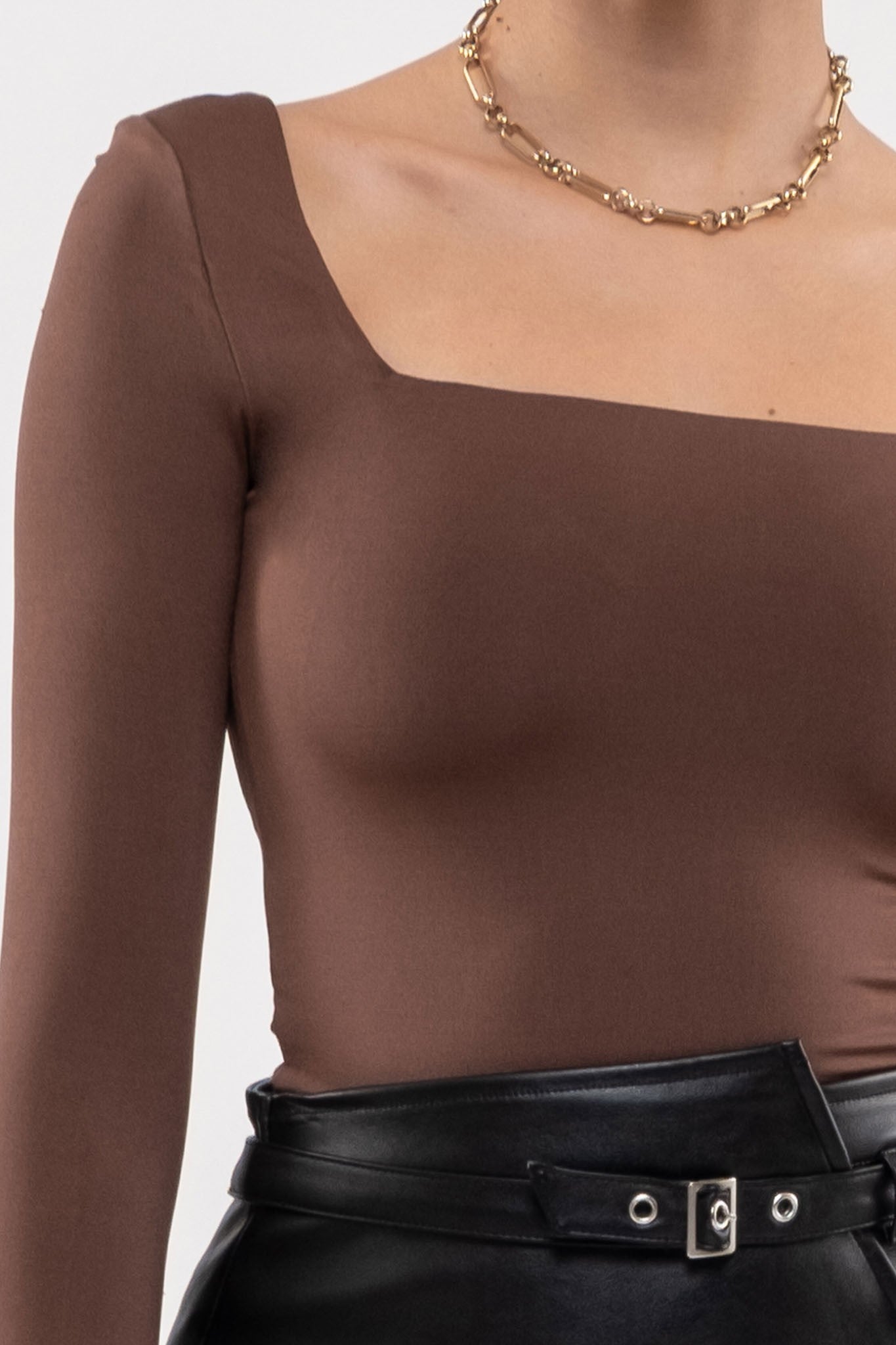 Long Sleeve, square neck, basic top in brown color.