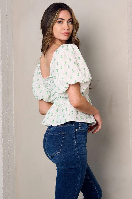 Score major style points with this puff sleeve top featuring a sweetheart neckline and textured green dots on a crisp white background.